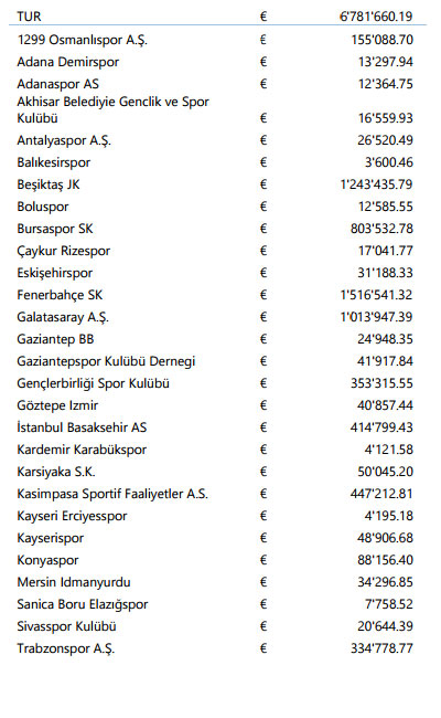 UEFA'nın dağıttığı 150 milyon eurodan ise Türk takımlarına toplam 6.781.660.09 euro düştü. Kasasına en çok para giren kulüp 1.516.541,32 euro ile Fenerbahçe olurken; sarı lacivertlileri 1.243.435,79 euro ile Beşiktaş ve 1.013.947,39 euro ile Galatasaray takip etti.
