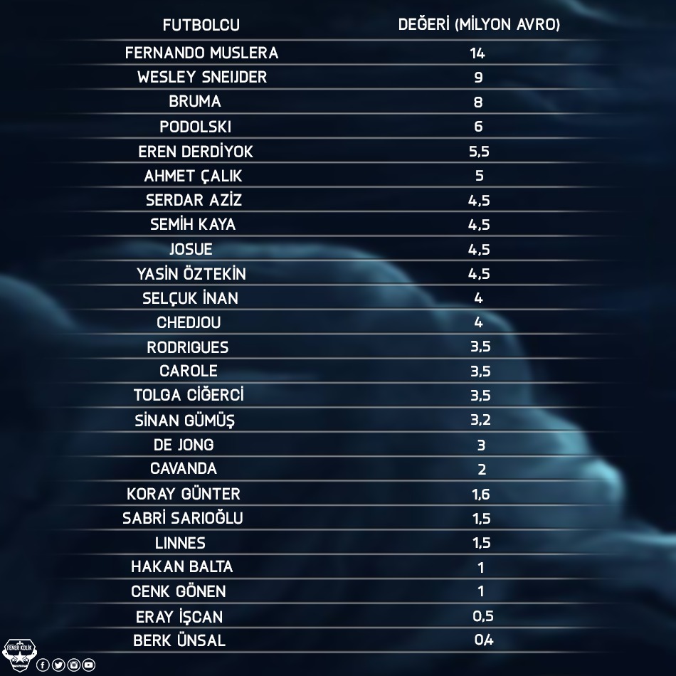 Muslera’yı 9 milyon euroluk değeriyle Hollandalı yıldız Wesley Sneijder ile 8 milyon euroluk değeriyle Portekizli genç oyuncu Armindo Bruma takip etti
