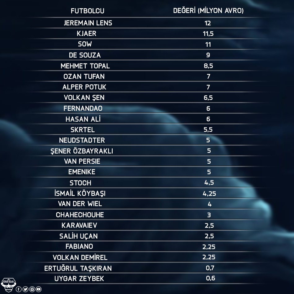 Lens’in 12 milyon değerle listenin en üstünde yer aldığı sarı-lacivertlilerde Kjaer 11,5 milyon euro ile ikinci, Birleşik Arap Emirlikleri’nin El Ehli takımından kiralanan Moussa Sow 11 milyon euroluk değeriyle üçüncü sırada yer aldı.