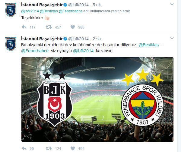 Kritik 90 dakika öncesi, "Bu akşamki derbide iki dev kulübümüze de başarılar diliyoruz. Siz oynayın Başakşehir kazansın" mesajı yollayan Başakşehir maç bitiminde de "Teşekkürler" mesajı yazarak, iki kulübe teşekkür etti!