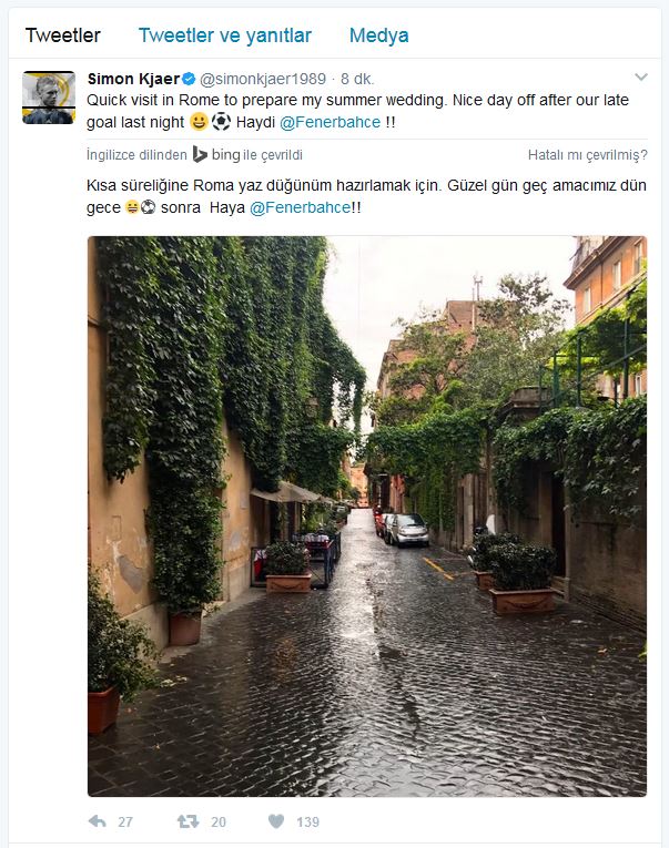 Danimarkalı başarılı savunmacı Kjaer, sosyal medya hesabından yaptığı payşlaşımda "Yaz için evlilik hazırlıkları düzenliyorum Roma'da. Güzel bir günün ardından gelmiş olmak da sevindirici. Haydi Fenerbahçe." notunu yazdı.