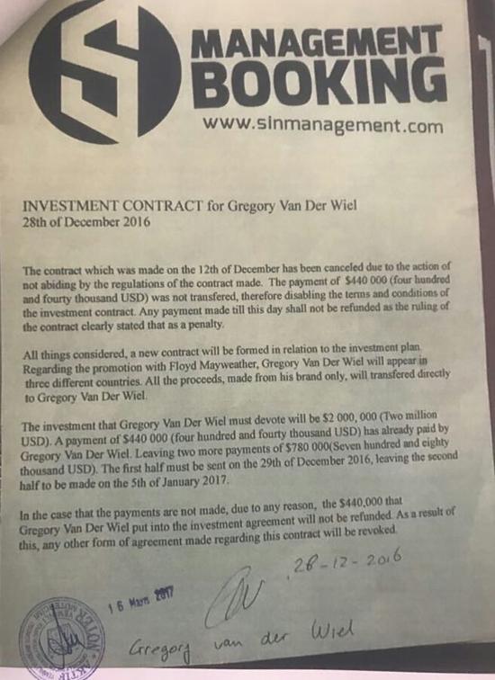 Kendisini dolandırdığını iddia ettiği ünlü menajer Ümit Akbulut'tan şikayetçi olan Fenerbahçe'nin Hollandalı futbolcusu Gregory van der Wiel, söz konusu kontratı Floyd Mayweather için imzalamış fakat, ünlü boksör Türkiye-Hollanda arasında yaşanan krizin ardından ilişkilerin askıya alınmasıyla birlikte Türkiye programını ertelemişti. Bu olayı duyan Wiel, taraflarca imzalanmış olan uluslararası sözleşme de geçen "Mücbir sebeplerden dolayı erteleme" maddesine uymadığı öğrenildi.