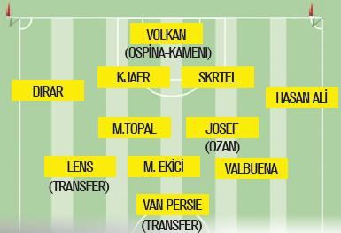 Kocaman’ın 11’inde yeni transferlerden Nabil Dirar sağ beke kaydırılıyor. Lens kalırsa yeri sağlam. Sağda Valbuena, forvet arkasında ise Mehmet Ekici yer alıyor... Forvet hattında transfer yapılacak. Bu yüzden Van Persie'nin yeri garanti değil. Volkan Demirel'in de Ospina ya da Kameni rakibi olacak. Rekabet de Fener'e yarayacak.