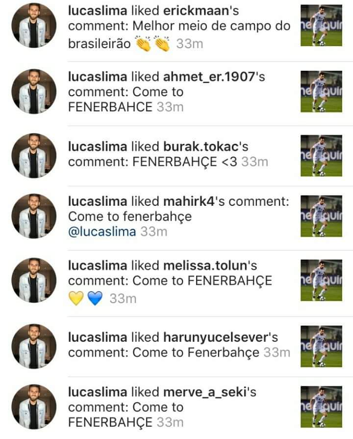 Fenerbahçemiz Brezilya'lı 10 numara için girişimlerini sürdürken Lucas Lima sosyal medya'dan Fenerbahçeli taraftarları heycanlandıracak hareket yaptı.
