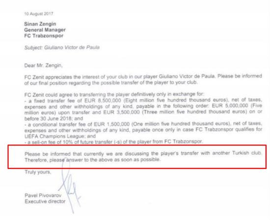 Trabzonspor'un Türk menajer aracılığı ile yaptığı anlaşmanın bir geçerliliği olmadığı belirtilirken, Zenit'in Trabzonspor'a gönderdiği belgede "Bir başka Türk kulübü ile de oyuncunun transferi için görüşüyoruz" şeklinde bir ifade kullanmasının, ceza ihtimalini azalttığı kaydedildi. FIFA, transfer konusunda Trabzonspor'un başvurusunu işleme alacak ve Zenit'in bir usulsüzlük yapıp yapmadığını inceleyecek. Zenit'e açılan dava sonunda, Fenerbahçe ya da Giuliano'nun bir ceza çıkma ihtimalinin oldukça düşük olduğu ifade ediliyor.