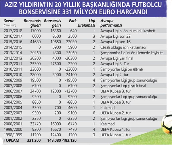 Habertürk'ün haberine göre. aslında, kötü geçen 2016/2017 sezonu ardından, teknik direktörlüğe Aykut Kocaman'ı getiren Fenerbahçe yönetimi, çok sayıda transfere de imza atarak sezona büyük umutlarla girmişti. Ancak, şu ana kadar ligde oynanan iki maçta da berabere kalınması ve Avrupa defterinin erken kapanması, "Yönetim transfer için harcama yapsa da yapmasa da boş" dedirtecek cinsten. Tıpkı, Aziz Yıldırım'ın 20 yıllık Fenerbahçe başkanlığı döneminin özeti gibi. Şöyle ki, Yıldırım'ın başkanlığı süresince transferde sadece futbolcu bonservisine toplam 331.2 milyon Euro para harcayan Fenerbahçe, aynı dönemde sattığı futbolculardan ise sadece 148 milyon Euro gelir elde etti.
