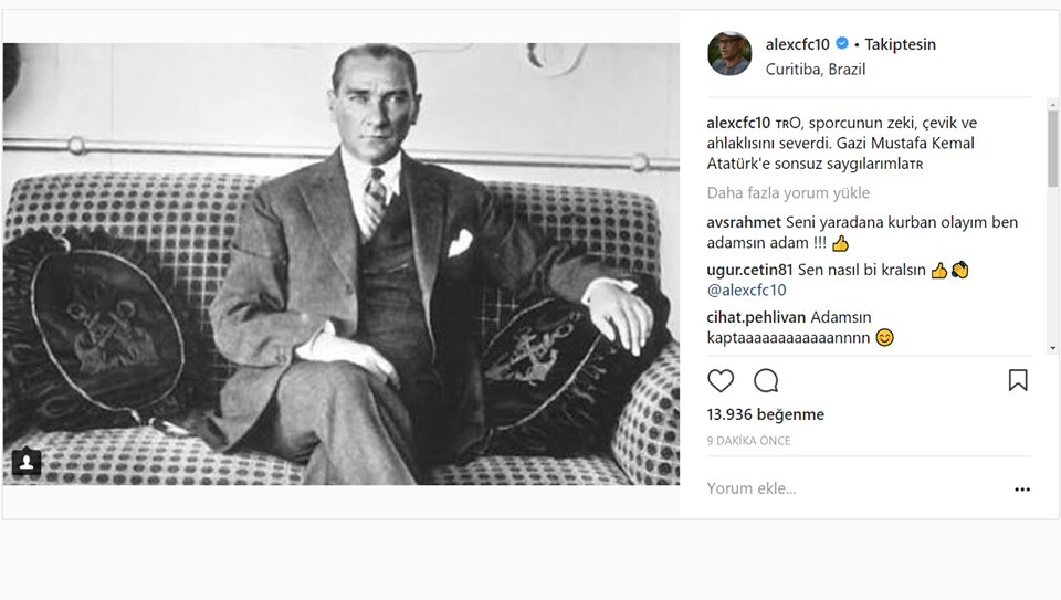 Alex, Instagram'dan yaptığı paylaşımda, "O, sporcunun zeki, çevik ve ahlaklısını severdi. Gazi Mustafa Kemal Atatürk'e sonsuz saygılarımla" ifadesini kullandı.
