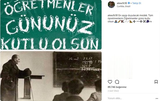 Fenerbahçe'nin Brezilyalı eski futbolcusu Alex de Souza, Öğretmenler Günü sebebiyle sosyal medya hesabından paylaşım yaptı. Atatürk'ün fotoğrafını paylaşan Brezilyalı, fotoğrafın altına; "En saygı duyulacak meslek. Tüm öğretmenlerin Öğretmenler günü kutlu olsun" notunu düştü.