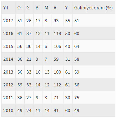 Fenerbahçe'nin son 8 yılda çıktığı resmi maçlarda aldığı sonuçların tablosu şöyle: