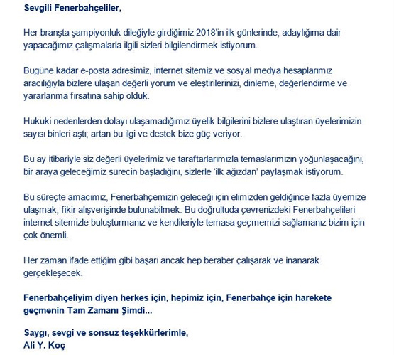 Sık sık sosyal medya hesabı Twitter aracılığıyla Sarı Lacivertli taraftarlara seslenen Koç'tan bir bildiri daha geldi.