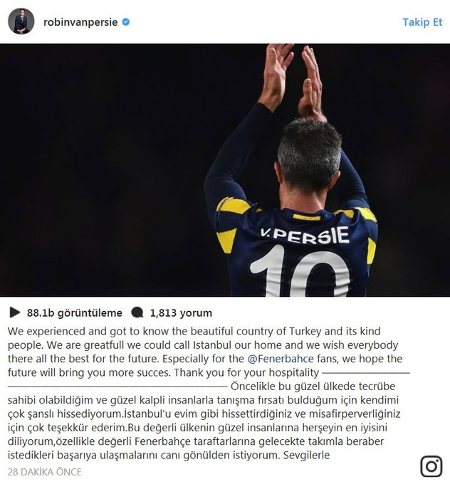 Hollandalı futbolcu mesajında, "Öncelikle bu güzel ülkede tecrübe sahibi olabildiğim ve güzel kalpli insanlarla tanışma fırsatı bulduğum için kendimi çok şanslı hissediyorum. İstanbul'u evim gibi hissettirdiğiniz ve misafirperverliğiniz için çok teşekkür ederim." ifadelerini kullandı.