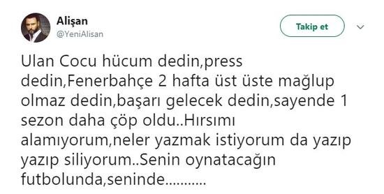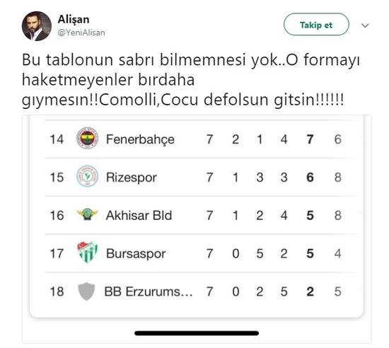 Ayrıca Fenerbahçe'nin 14. sırada olduğu puan durumunu paylaşan Alişan, "Bu tablonun sabrı bilmem nesi yok. O formayı hak etmeyenler bir daha giymesin! Comolli, Cocu defolsun gitsin!!!!!!" tepkisini gösterdi.