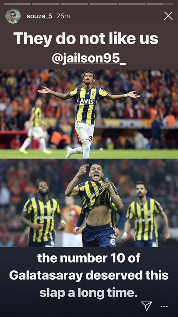 Josef de Souza, Jailson ve kendisinin Galatasaray'a attığı gollerin sevinçlerini paylaşarak, "Bizi sevmiyorlar Jailson. Galatasaray'ın 10 numarası bu tokadı uzun süredir hak ediyordu." ifadelerine yer verdi