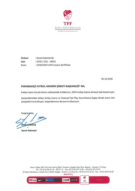 Üzerinde Türkiye Futbol Federasyonu Başkanı Yıldırım Demirören ve Genel Sekreter Kadir Kardaş’ın imzalarının bulunduğu 2018-2019 Sezonu UEFA Kulüp Lisans ve Finansal Fair Play Lisans Sertifikası, TFF Genel Sekreterliği’nin ilgili yazısıyla birlikte Kulübümüze gönderildi. Yazıda, “Kulüp Lisans Kurulu Kararı neticesinde, Kulübünüz UEFA Kulüp Lisansı almaya hak kazanmıştır. Çalışmalarından dolayı Kulüp Lisans ve Finansal Fair Play Sorumlunuz başta olmak üzere tüm çalışanlarınızı kutluyor, başarılarınızın devamını diliyorum" ibarelerine yer verildi."