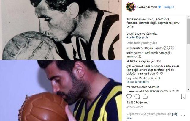 Fenerbahçeli file bekçisi Volkan Demirel, sosyal medya hesabı üzerinden Lefter Küçükandonyadis ve kendisinin olduğu bir fotoğrafı paylaştı. Yıldız oyuncu, fotoğrafla birlikte Lefter'in, "Ben, Fenerbahçe formasını sırtımda değil, başımda taşıdım" sözünü alıntılayarak, "Sevgi, Saygı ve Özlemle... #Lefter93yaşında" açıklamasında bulundu.