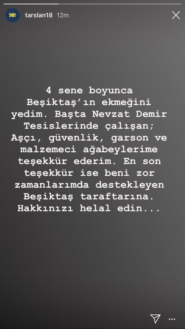 Sosyal medya hesabından kendisi üzerinde emeği olan herkese teşekkür eden Tolgay Arslan, "4 sene boyunca Beşiktaş'ın ekmeğini yedim. Başta Nevzat Demir Tesisleri'nde çalışan aşçı, güvenlik, garson ve malzemeci ağabeylerime teşekkür ederim. En son teşekkür ise beni zor zamanlarımda destekleyen Beşiktaş taraftarına. Hakkınızı helal edin" açıklamasını yaptı.