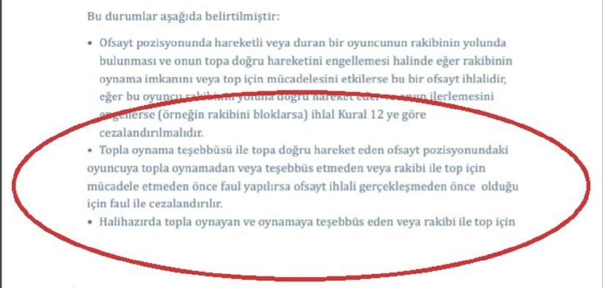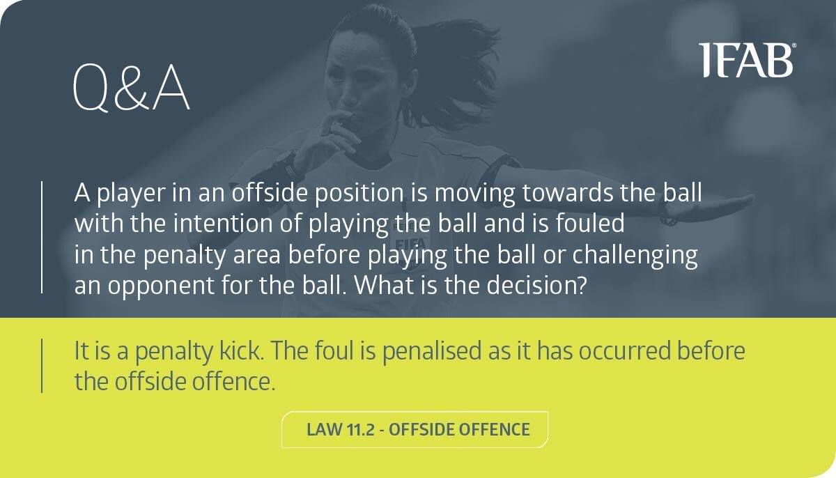 Penaltı. Faul ofsayt öncesinde gerçekleştiği için penaltı ile sonuçlanır.” ifadeleri yer alırken Türkçe kural kitabı da pozisyonu “Topla oynama teşebbüsü ile topa doğru hareket eden ofsayt pozisyonundaki oyuncuya topla oynamadan veya teşebbüs etmeden veya rakibi ile top için mücadele etmeden önce faul yapılırsa ofsayt ihlali gerçekleşmeden önce olduğu için faul ile cezalandırılır” şeklinde açıklıyor.