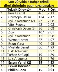 Sabah'ın haberine göre; Fenerbahçe ile 2014-15 sezonunda zirve yarışını son ana kadar götüren İsmail Kartal ise 46 maçta 2,13 puan ortalamasına ulaşarak listede zirveye oturdu. 2. sıraya ilk döneminde 134 maçta 2,12 puan ortalaması olan Daum yerleşti. Üçüncülük ise Aykut Kocaman ile Vitor Pereira'nın oldu.