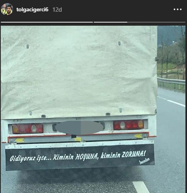 Arkasında ‘Gidiyoruz işte… Kiminin hoşuna, kiminin zoruna!’ yazılı bir kamyon fotoğrafı paylaşan Tolga’nın bu paylaşımı sosyal medyada gündem oldu.