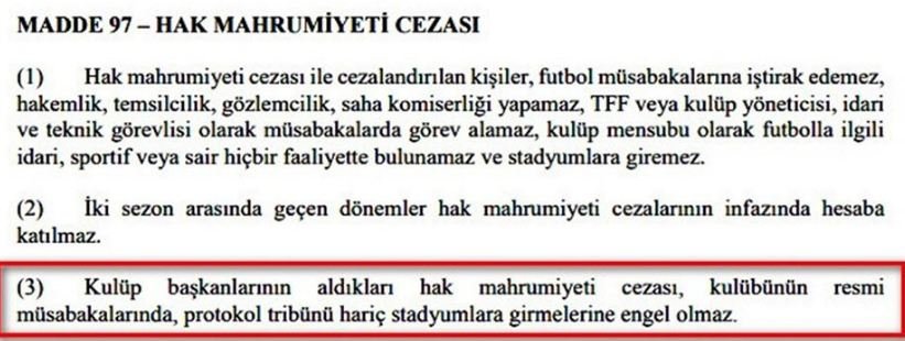 Değiştirilen talimattan ilk olarak Galatasaray Başkanı Mustafa Cengiz faydalanmıştı. Geçtiğimiz sezon PFDK’nın 150 gün hak mahrumiyeti cezası verdiği Mustafa Cengiz, cezasının bitmesine 48 gün kala değişen talimat sonrası Erzurumspor maçını tribünden takip edebilmişti. Mustafa Cengiz, deplasmanda oynanan Erzurumspor maçını locadan izlemişti.