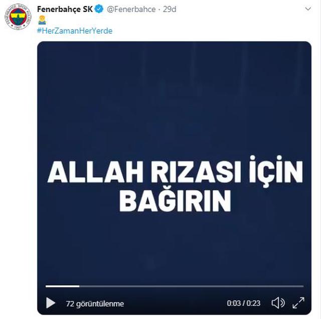 Kulübün yaptığı son derbi paylaşımında Türk Telekom Stadı'nda oynanan Galatasaray-Fenerbahçe maçında Sarı Lacivertli taraftarlar sürekli olarak tezahürat yapıyor ve deplasman seyircisi olmalarına rağmen o an için Galatasaray taraftarından daha çok sesleri çıkıyor.
