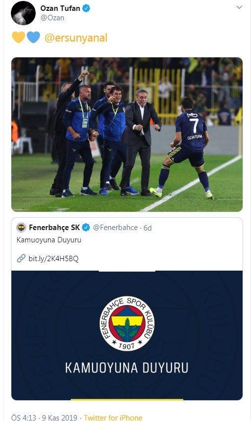 Teknik direktör Ersun Yanal ile birlikte olduğu bir fotoğrafı paylaşan Tufan, paylaşımına sarı - lacivert kalp bırakarak Ersun Yanal'ı etiketledi.