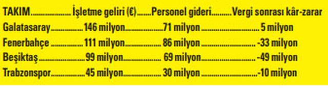 KPMG Football Benchmark’ın analizine göre son iki sezonun Süper Lig şampiyonu Galatasaray, 146 milyon euroluk işletme geliriyle zirvede yer aldı. 111 milyon euroluk geliriyle Fenerbahçe ikinci, Beşiktaş ise 99 milyon euroyla üçüncü sırada yer alıyor. Trabzonspor’un işletme geliri ise 45 milyon euro… Vergi sonrası kâr-zararda tek artıya geçen kulüp de 5 milyon euroyla Galatasaray oldu. (Akşam)