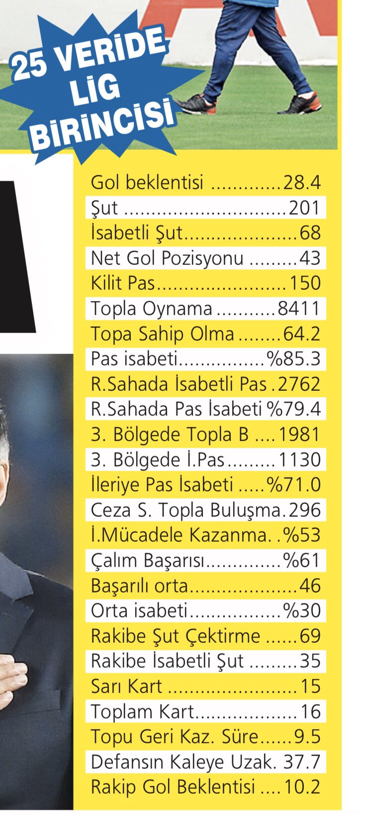 Sözcü Gazetesi'nden Sercan Hamzaoğlu'nun haberine göre, sarı-lacivertliler, bu sezon tüm istatistiklerde 29 verinin 25'inde lig birincisi olarak dikkat çekiyor. Fenerbahçe, gol beklentisi, şut, net gol pozisyonu, kilit pas, topa sahip olma, 3. Bölgede topla buluşma ve pas isabet, isabetli orta topu geri kazanma süresi gibi alanlarda rakipsiz.