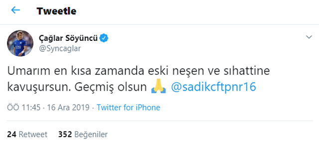 Sadık'a bir mesaj da Leicester City forması giyen Çağlar Söyünücü'den geldi. Başarılı futbolcu twitter hesabından Sadık'ı metionlayarak şunları yazdı...