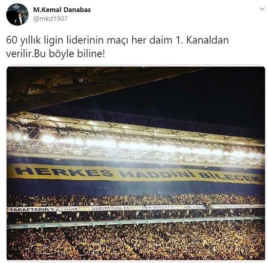 Fenerbahçe yöneticisi Mustafa Kemal Danabaş, "Herkes haddini bilecek" pankartıyla birlikte "60 yıllık ligin liderinin maçı her daim 1. Kanaldan verilir. Bu böyle biline!" şeklinde bir paylaşım yaptı.