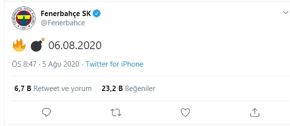 Fenerbahçe kulübü resmi twitter hesabından bomba emojisiyle 6 Ağustos tarihini gösterdi ve taraftarları heyecanlandıran bir paylaşım yaptı.