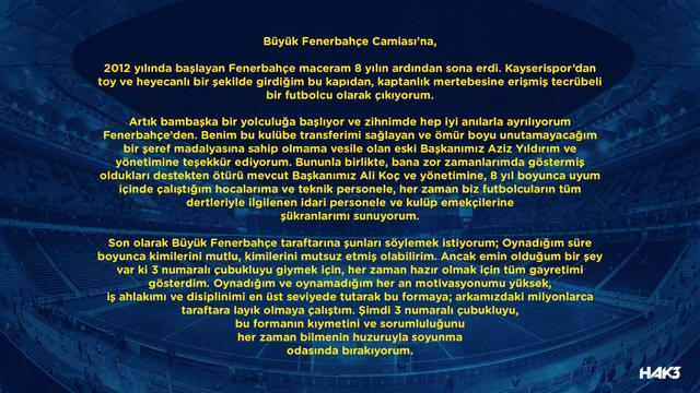 Hasan Ali Kaldırım'ın yaptığı açıklama şu şekilde: "2012 yılında başlayan Fenerbahçe maceram 8 yılın ardından sona erdi. Kayserispor'dan toy ve heyecanlı bir şekilde geldiğim bu kapıdan kaptanlık mertebesine erişmiş bir tecrübeli oyuncu olarak çıkıyorum. Artık bambaşka bir yolculuğa başlıyor ve zihnimde hep iyi anılarla ayrılıyorum Fenerbahçe'den. Benim bu kulübe transferini sağlayan ve ömür boyu unutamayacağım bir şeref madalyasına sahip olma vesile olan eski başkanımız Aziz Yıldırım ve yönetimini teşekkür ediyorum. Bununla birlikte, bana zor zamanlarımda göstermiş oldukları destekten destekten ötürü mevcut başkanımız Ali Koç yönetimine, 8 yıl boyunca uyum içinde çalıştığım hocalarıma ve teknik personele, her zaman biz futbolcuların tüm dertleriyle ilgilenen idari personele ve kulüp emekçilerine şükranlarımı sunuyorum. Son olarak büyük Fenerbahçe taraftarlarına şunları söylemek istiyorum; Oynadığım süre boyunca kimilerini mutlu kimilerini mutsuz etmiş olabilirim. Ancak emin olduğum bir şey var ki 3 numaralı çubuklu giymek için her zaman hazır olmak için tüm gayreti gösterdim oynadığım ve oynamadığım her an motivasyonumu yüksek, iş ahlakımı ve disiplinimi en üst seviyede tutarak bu formaya; arkamızdaki milyonlarca taraftarı layık olmaya çalıştım. Şimdi 3 numaralı çubukluyu, bu formanın kıymetini ve sorumluluğunu her zaman bilmenin huzuruyla soyunma odasında bırakıyorum."
