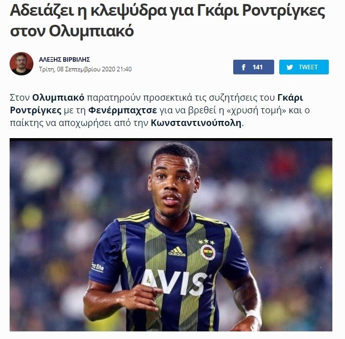 Sarı lacivertlilerden ayrılması beklenen Garry Rodriguesile ilgili Yunan basınında flaş bir habere yer verildi. Haberde Olimpiakos'un, Al İttihad ile anlaşmasına rağmen Fenerbahçe'nin Rodrigues ile ayrılığa dair uzlaşma sağlayamaması nedeniyle Yunan ekibinin transferden vazgeçebileceği iddia edildi. İşte detaylar...