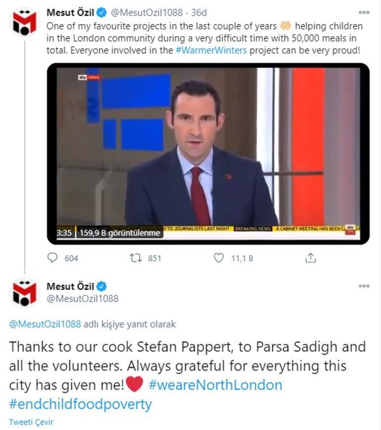 Son yıllarda Londra'daki yoksul çocuklara yemek servis edilmesi için düzenlenen bir projeye katılan Mesut Özil, bu konuyla ilgili attığı tweeetlerde şu ifadeleri kullandı: