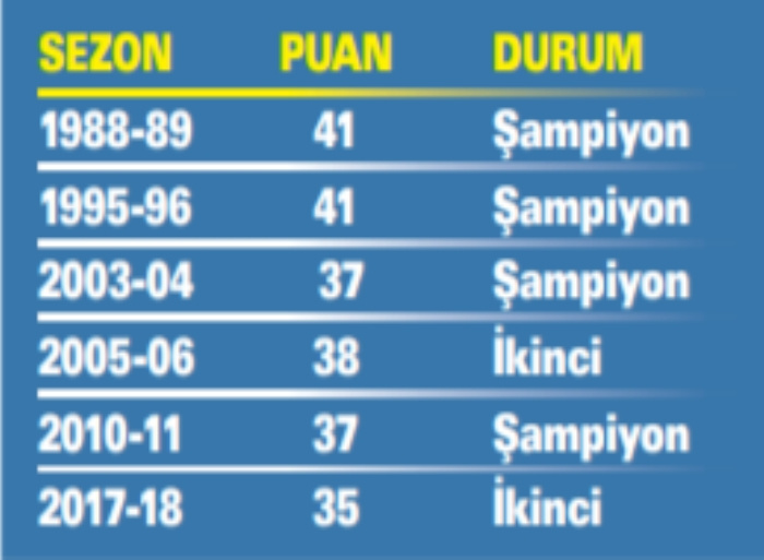 Fenerbahçe, deplasmanda 14 maçta 35 puan topladı. Kanarya 35 ve üzeri puan topladığı 6 sezonun 4'ünde şampiyonluğa ulaştı.