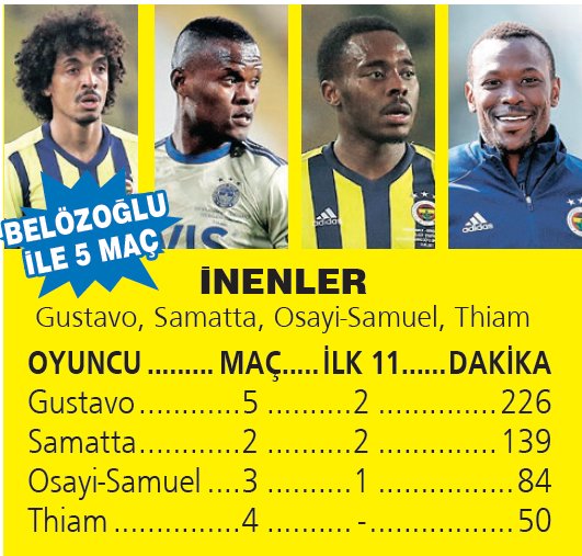 Luiz Gustavo, 5 maçın 2'sinde ilk 11'de şans buldu. Samatta, Osayi-Samuel ve Thiam da ‘yedek oyuncu' statüsüne düştü. Belözoğlu'nun 5 maçlık döneminde öne çıkan, Bulut'un çok tercih etmediği 4 isim var: Valencia, İrfan Can, Sosa ve Mert Hakan. Valencia'yı Bulut'un aksine santrfor olarak kullanan Belözoğlu, Sosa'yı ön liberoda, İrfan Can ve Mert Hakan'ı da ofansif orta sahada kullanıp takımın hücumdaki verimliliğini bir hayli artırdı.