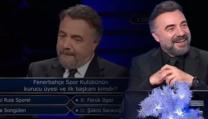 1 MİLYON TL’LİK SORU FENERBAHÇE ÜZERİNEYDİ 1 milyon TL değerindeki soru “Fenerbahçe Spor Kulübü’nün kurucu üyesi ve ilk başkanı kimdir?” şeklinde geldi. Şıklarda Zeki Rıza Sporel, Faruk Ilgaz, Ziya Songülen ve Şükrü Saracoğlu yer aldı.