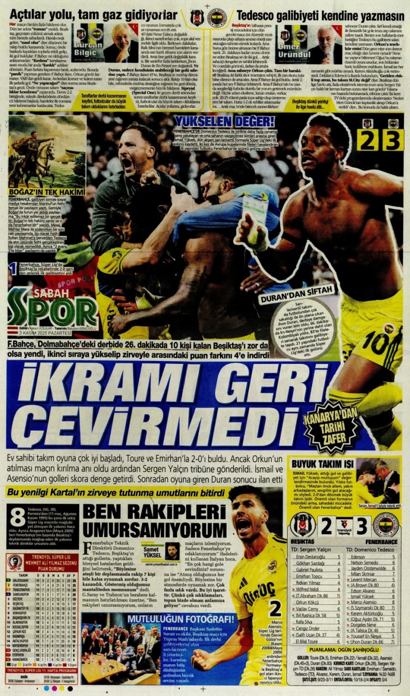 3 Kasım 2025 – Gazetelerde FENERBAHÇE