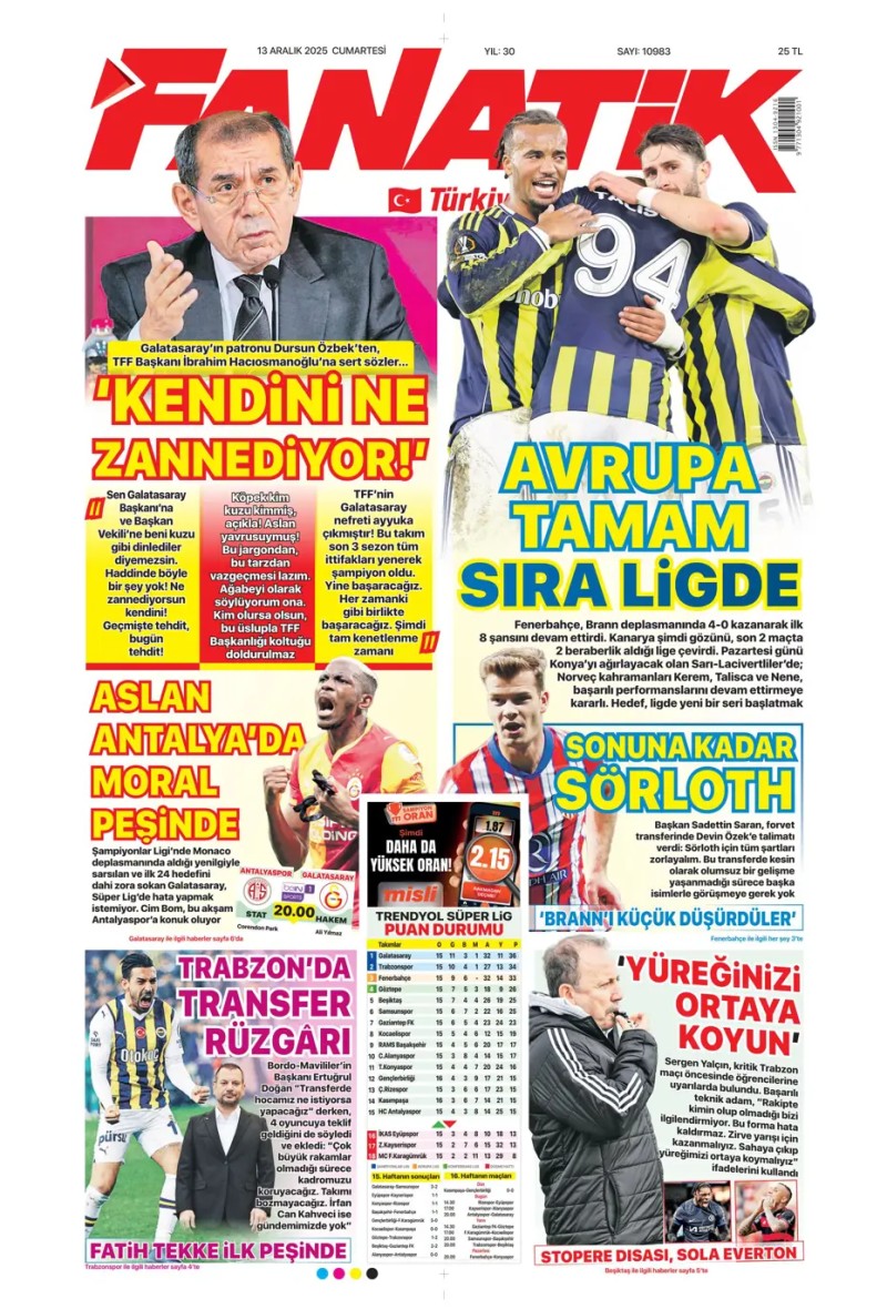 13 Aralık 2025 – Gazetelerde FENERBAHÇE