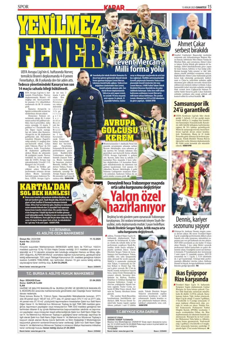 13 Aralık 2025 – Gazetelerde FENERBAHÇE