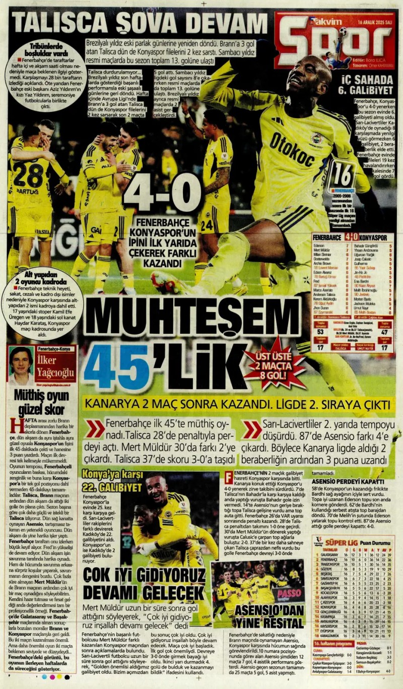 16 Aralık 2025 – Gazetelerde FENERBAHÇE