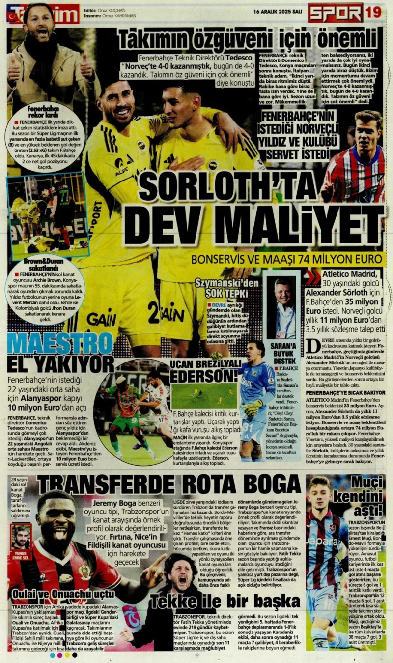 16 Aralık 2025 – Gazetelerde FENERBAHÇE