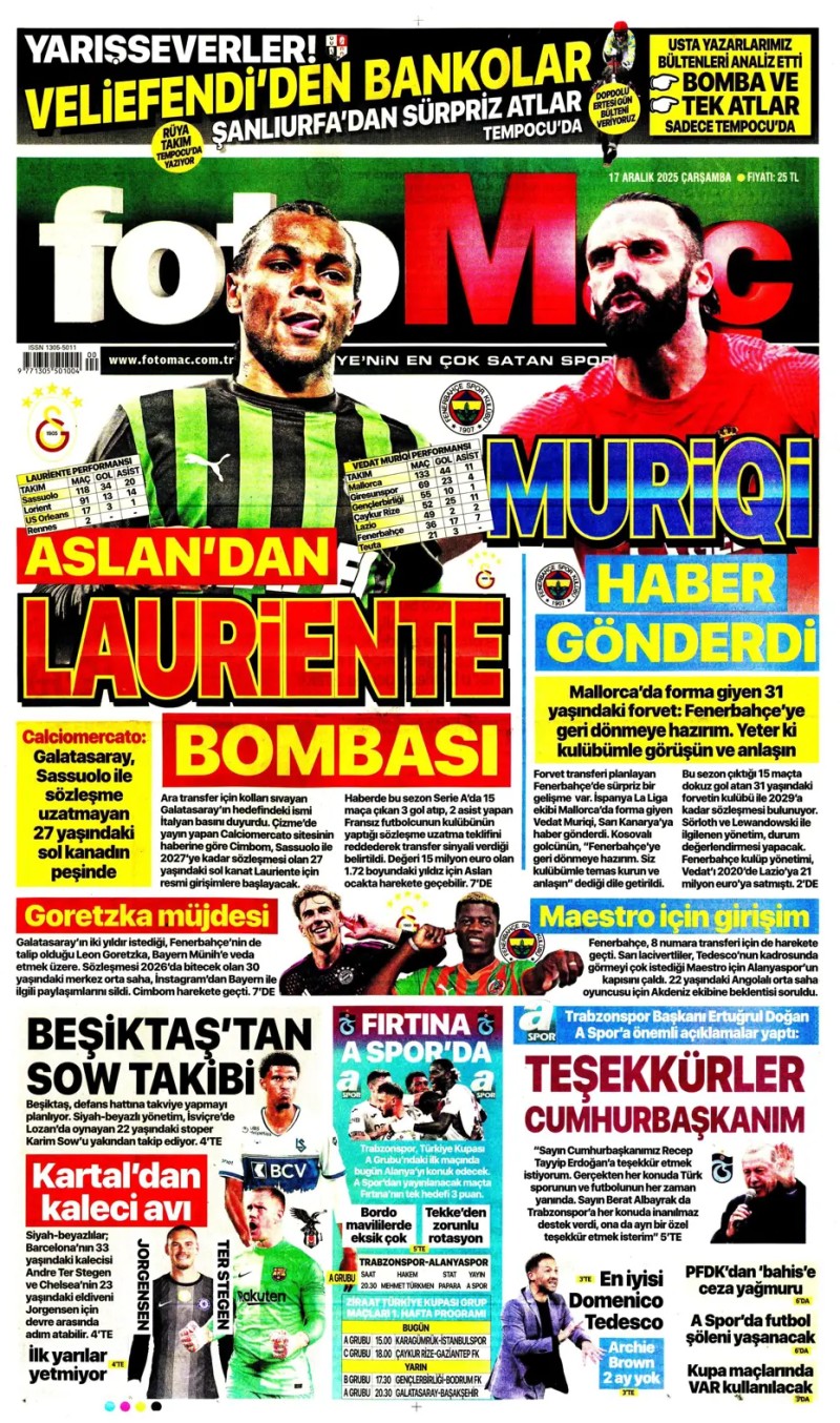 Bugün gazetelerde öne çıkan tüm FENERBAHÇE manşetlerine hızlıca göz atabilirsiniz! FENERBAHÇE manşetleri (17 Aralık 2025)
