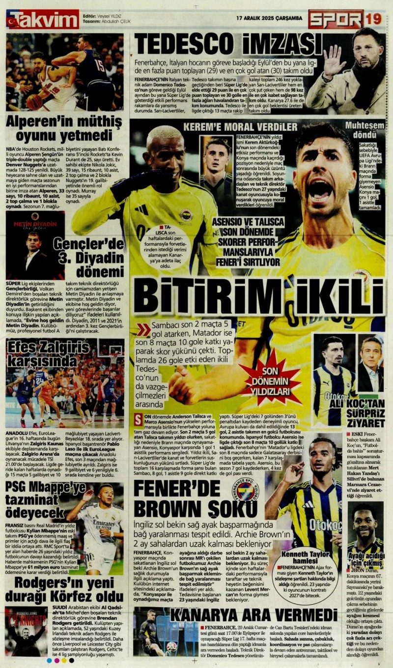 Bugün gazetelerde öne çıkan tüm FENERBAHÇE manşetlerine hızlıca göz atabilirsiniz! FENERBAHÇE manşetleri (17 Aralık 2025)