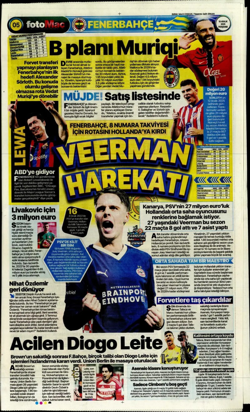 18 Aralık 2025 – Gazetelerde FENERBAHÇE