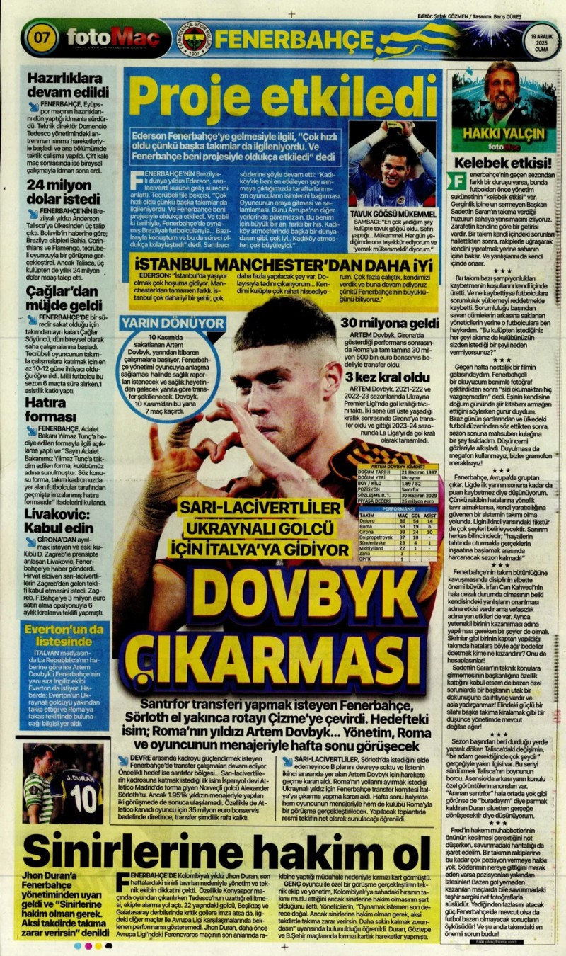 Bugün gazetelerde öne çıkan tüm FENERBAHÇE manşetlerine hızlıca göz atabilirsiniz! FENERBAHÇE manşetleri (19 Aralık 2025)