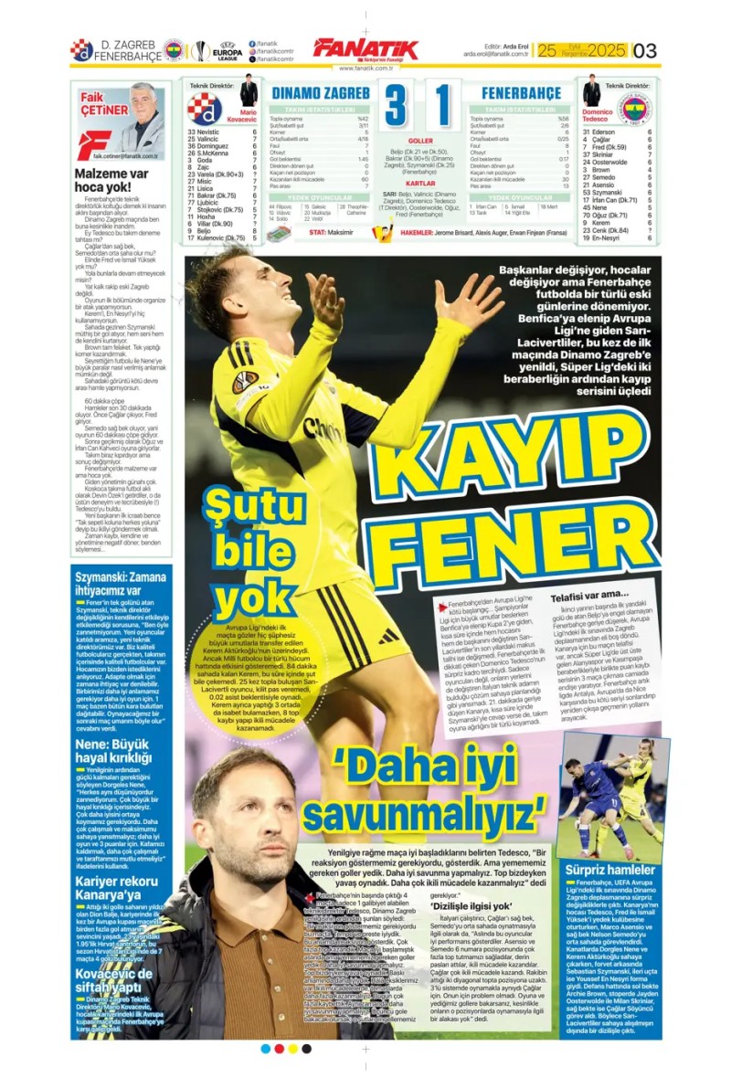 25 Eylül 2025 – Gazetelerde FENERBAHÇE