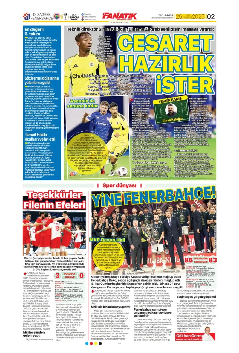 25 Eylül 2025 – Gazetelerde FENERBAHÇE
