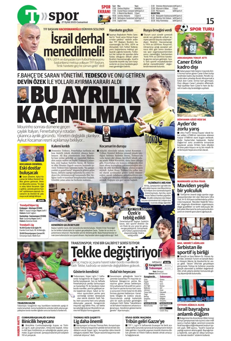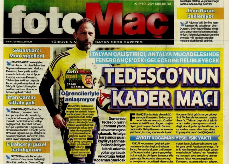 27 Eylül 2025 – Gazetelerde FENERBAHÇE