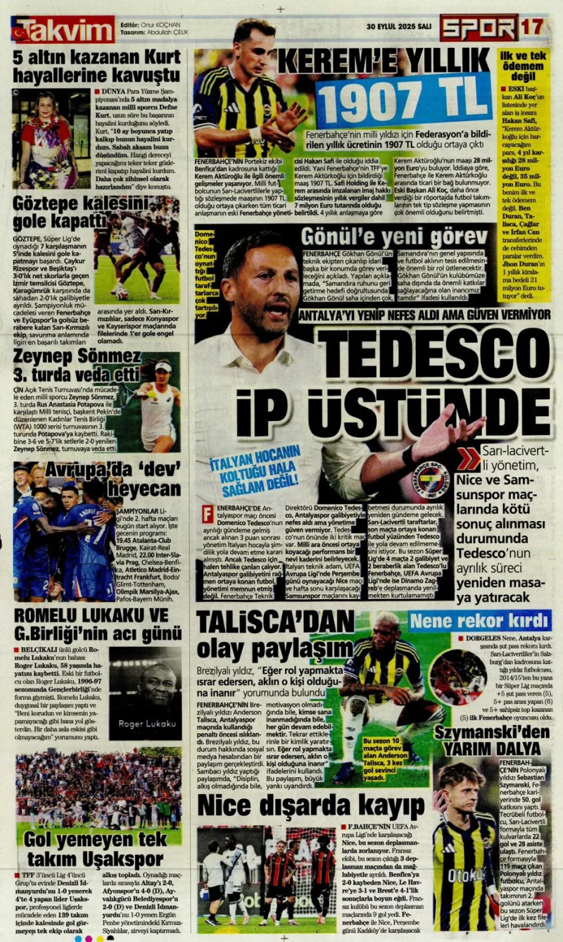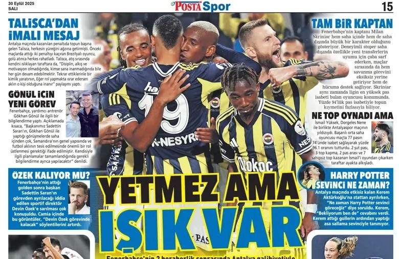 30 Eylül 2025 – Gazetelerde FENERBAHÇE